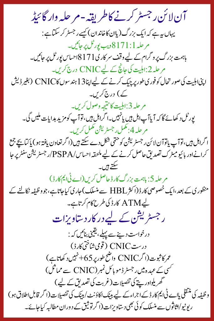 - Digital & Offline Modes: Registration is imaginable via 8171 web doorway, via SMS in particular cases, or at physical Ehsaas / PSPA / enablement centers.
