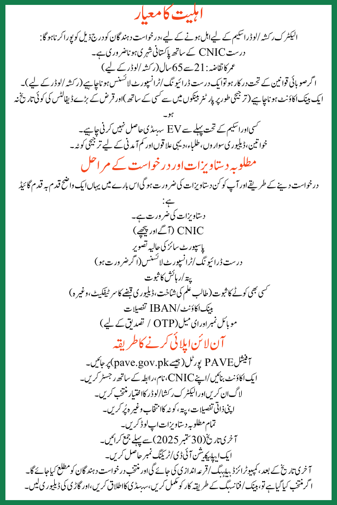 A: Pakistani citizens aged 21–65 (for rickshaw / loader), valid CNIC, meeting eligibility and quota criteria.