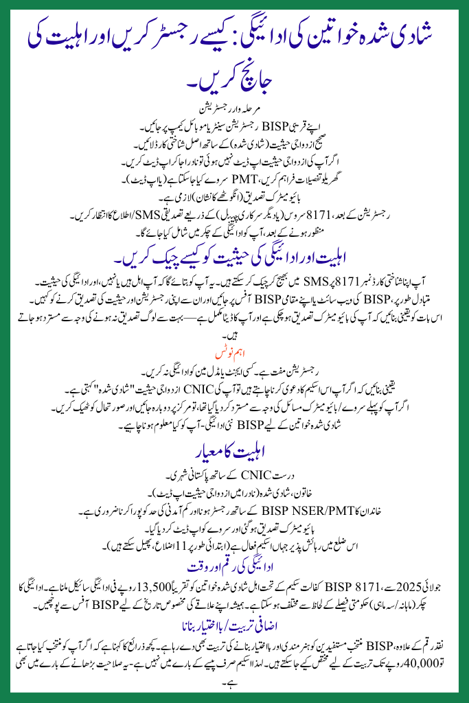 In simple words: if you are a married woman in Pakistan, living in a low-income household, you may now be eligible for the BISP New Payment for Married Women scheme of 2025. The process is straightforward: check your marital status, ensure you are registered with BISP, complete biometric verification, and delay for the cash payment of about Rs 13,500. The scheme also offers authorization and training aimed at some recipients.